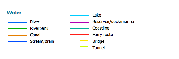 Первоисточник: http://www.openstreetmap.org Showing different types of water feature.